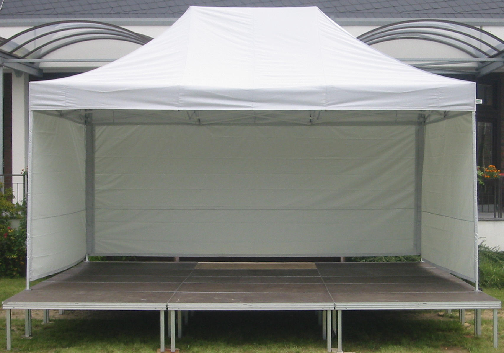 12 Bühnenteile, Höhe je nach Wunsch bis 1,4m mit passendem Geländer, 4-seitig schwarzem Skirting Dazu ein lichtgraues Bühnendach mit drei Seiten schwarzer Gaze und einer Treppe mit Geländer